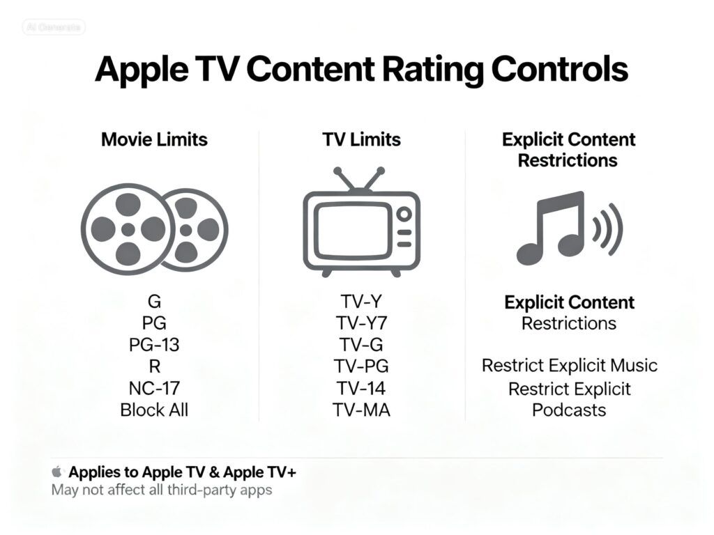 - You can restrict content by age rating and block explicit material through Apple TV’s built-in parental controls