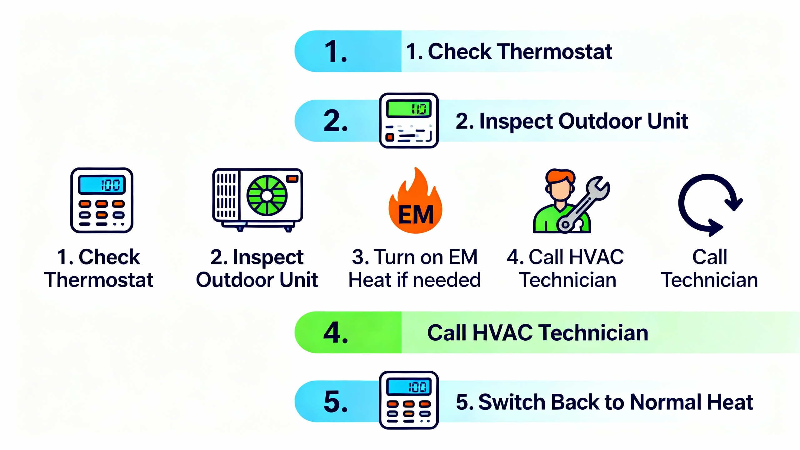 EM Heat is a temporary solution — a professional needs to diagnose and repair the root problem. - Switch Back to Normal “HEAT” Mode